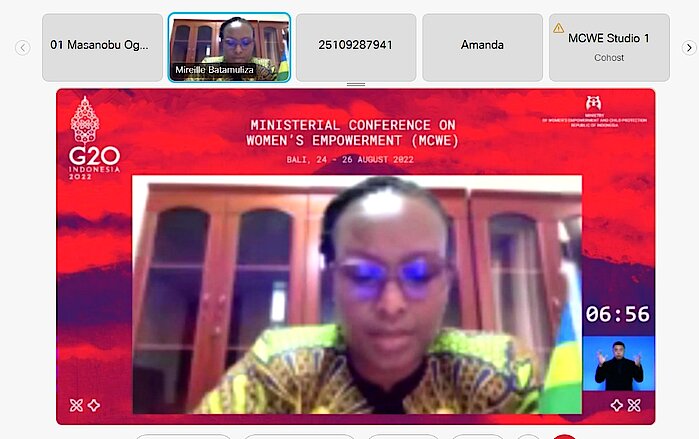 It was highlighted on 24 August 2022 by Mrs. Mireille BATAMULIZA, Permanent Secretary at MIGEPROF on behalf of Prof. Jeannette BAYISENGE, the Minister of Gender and Family Promotion while delivering a statement entitled: Closing Digital Gender Gap: Women’s Participation in the Digital Economy and Future Work during The G20 Ministerial Conference on Women’s Empowerment (MCWE).