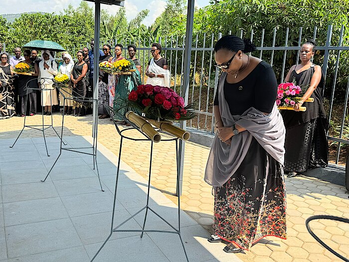The minister laying a wreath of roses at Kibirizi memorial site where around 454 women and children, victims of the genocide, are laid to rest.
